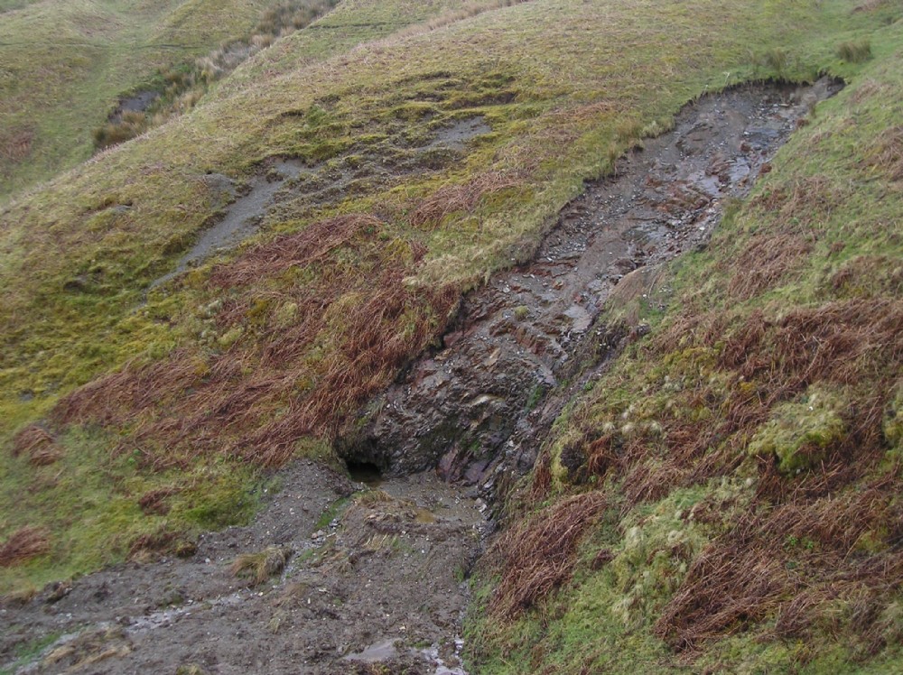 This level is near the ridge top above Dylife. It was hidden from view by vegetation, but this small landslip has exposed it.