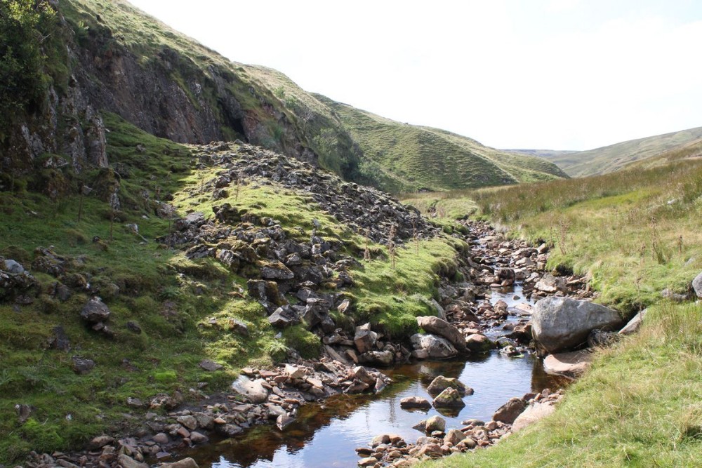 Small tip from shaft and openworking on a copper vein at the head of Great Sleddale. the small scarp is the footwall of the vein.