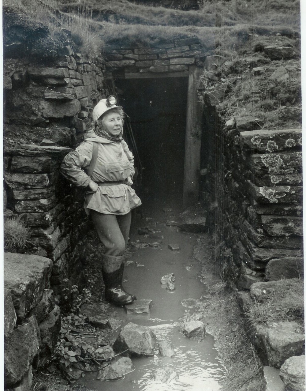 Mrs HG MacPherson modelling the latest "must have" outfit for underground explorers (experts can say whether it looks better than an oversuit/drysuit). Peter Jackson's info is that Eric Richardson had the entrance rebuild in 1965.