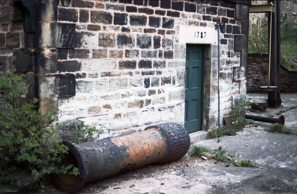 Snore pipe and engine house doorway with 1787 datestone, Elsecar Newcomen pumping engine house, 6th May 1984. (Scanned from a damaged slide, image restored as much as possible in Photoshop).
