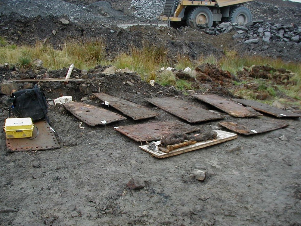 Artifacts recovered fro site, include parts of water tank from cage, truck coupling