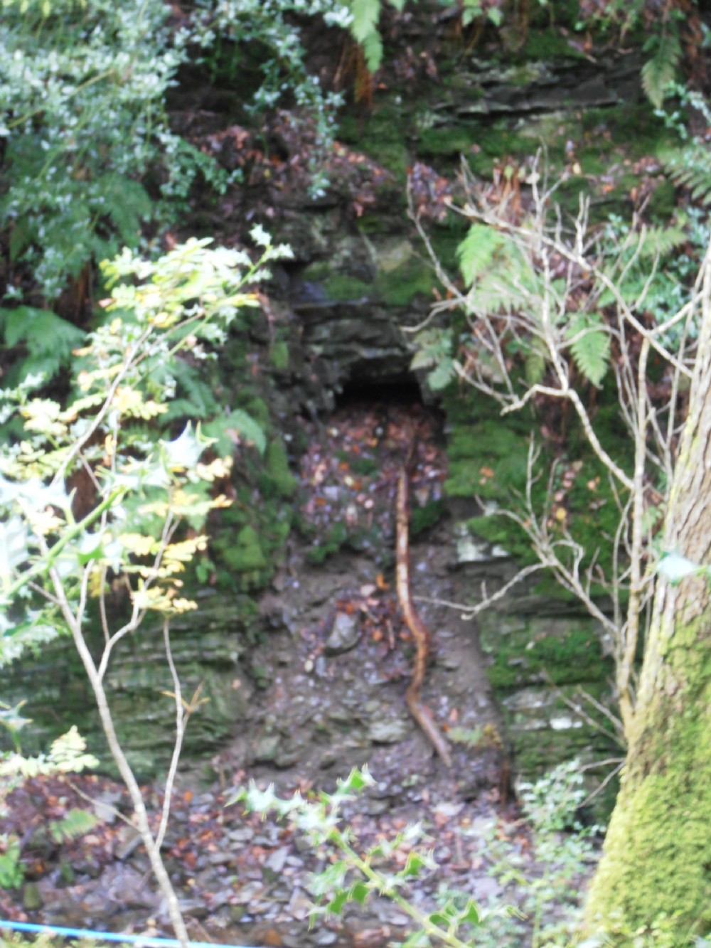 A small nearly blocked trial by the stream. Inside, the small cavern is filled to the brim with old alcoholic drink bottles - some may be valuable.