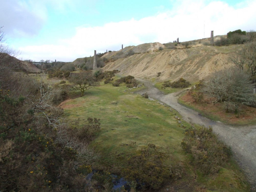 Photo from The Liskeard and Caradon railway embankment R to L Jopes Engine house and Stack. Pearce's Engine House and Stack. Sump Shaft House and Stack. Stampes engine Stack. Gonamena Hingston's 50in Engine House 25-02-12