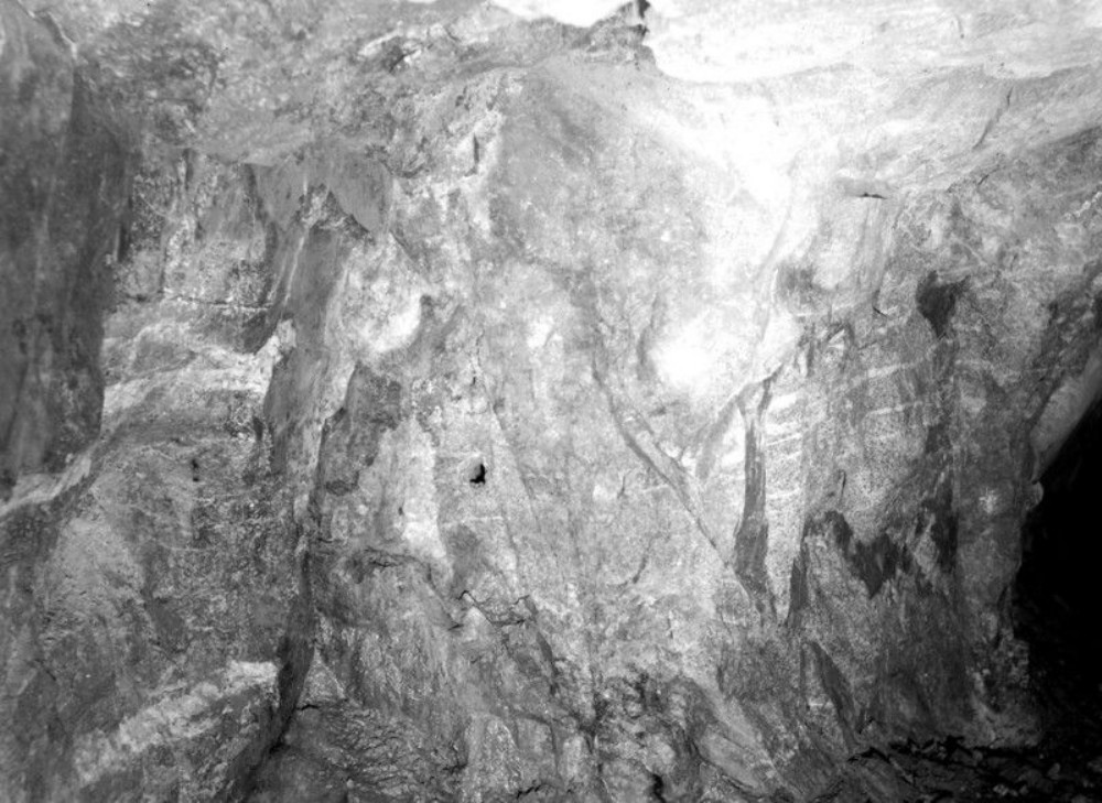 South Crofty Mine, Carn Brea. South Crofty Mine: No. 2 Lode, Robinson's Section. View in the side of the 310-fm. Level, Robinson's Section on No. 2 Lode, showing the granite country traversed by irregular tourmaline-chlorite veins and by horizontal quartz-veins (see also A8103).