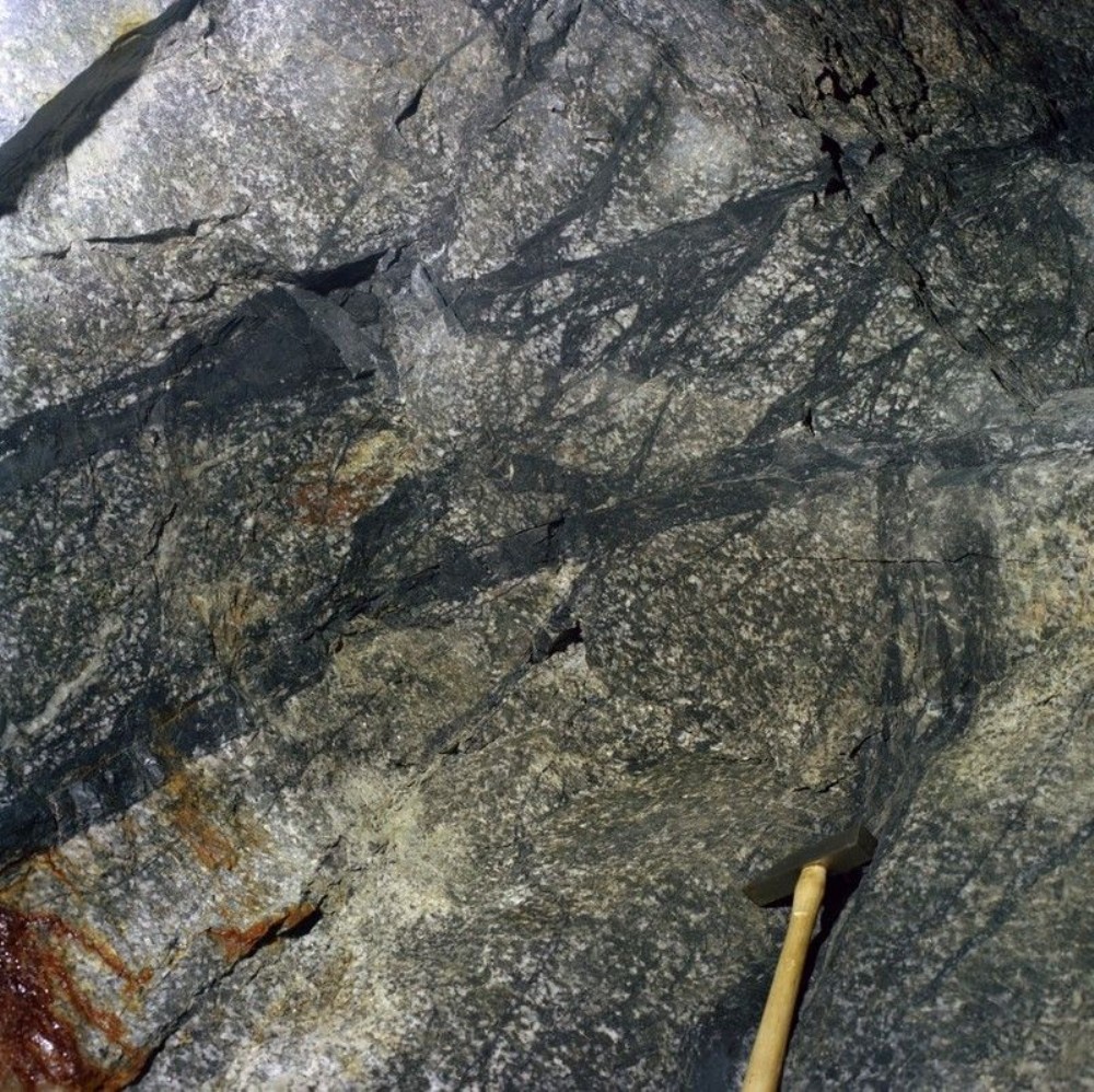 South Crofty Mine, Robinson's Section, 380 fm. level, No. 4 lode west. Cassiterite/tourmaline filled fractures forming No. 4 lode seen in the roof of drive in megacrystic, coarse-grained, biotite-granite.