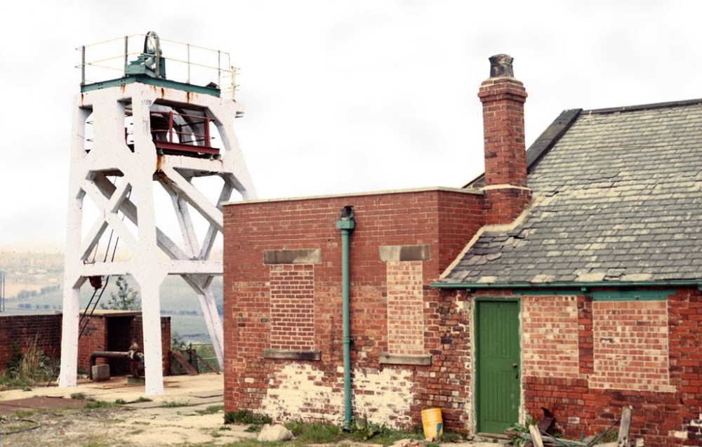 View from the road entrance of the Southern concrete headframe and Ventilation Fan House (right), 6th May 1984. (Scanned from a damaged slide, image restored as much as possible in Photoshop).