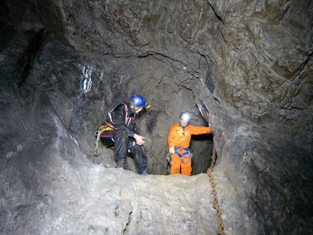Sparty_lea and Timberman in a small blind-ending passageway off the deep adit level, Bwlchglas Lead Mine.