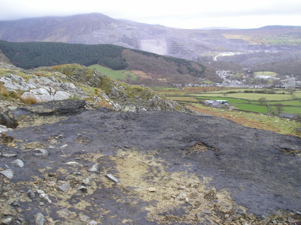 Looking out towards Braich Melyn and Penrhyn Quarry beyond. The latter shows the way the upper terraces are disappearing.