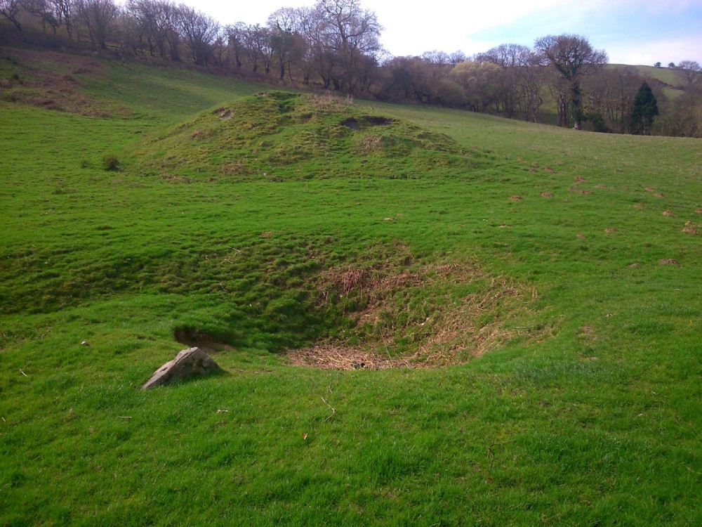 A collapsed stope or level sits between the spoil heap for the top level and the main shaft. The stone with the drill hole is next to the collapse.