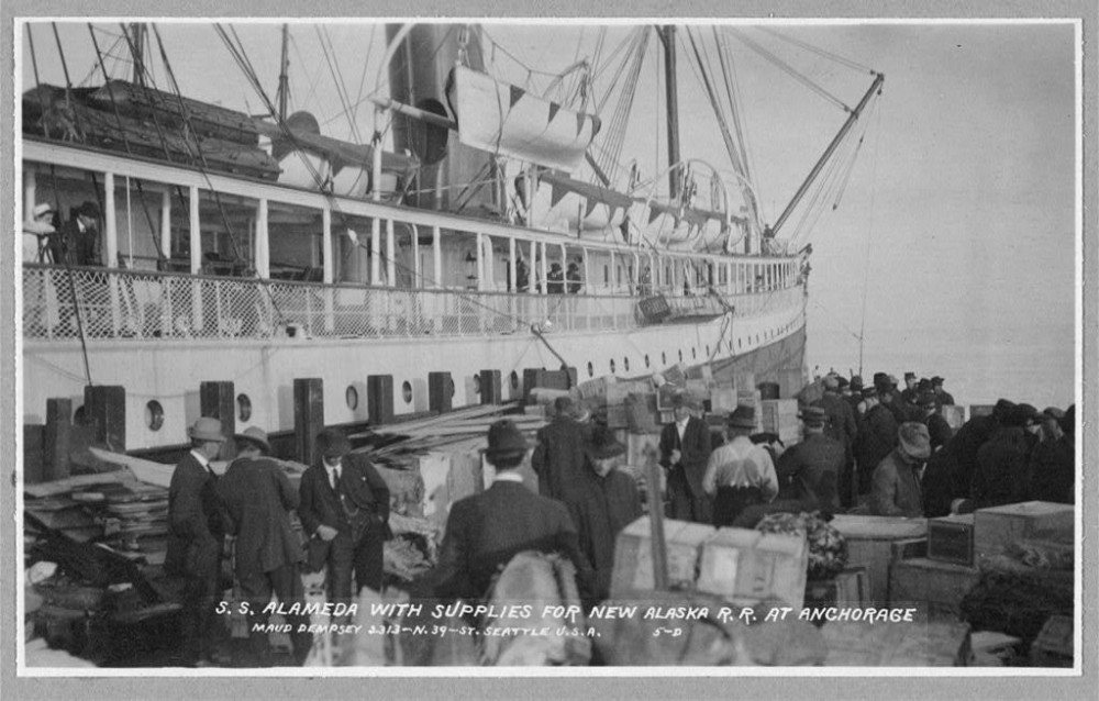 S.S. Alameda unloading railway equipment at Anchorage.