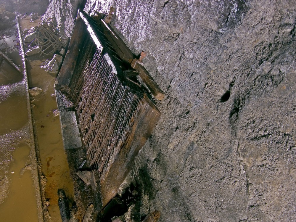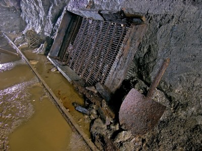 A rule for measuring stemples, 40 yard level, on top of a large sieve for sorting and grading ore.