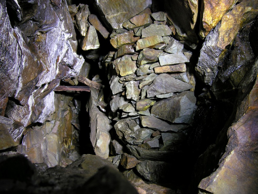 And to the east of the short adit, a section of backfilled stacked deads and a couple of stemples - the rock her was very broken and close to the surface.