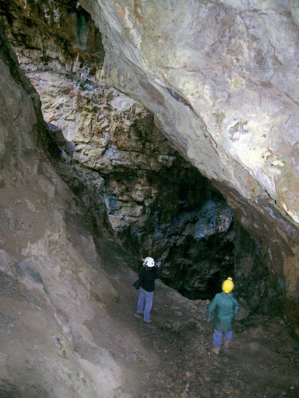 One of the stopes (or gunnises if you are Cornish) that come to surface at Mountain Mine, still with signs of Azurite and Malachite on the walls.