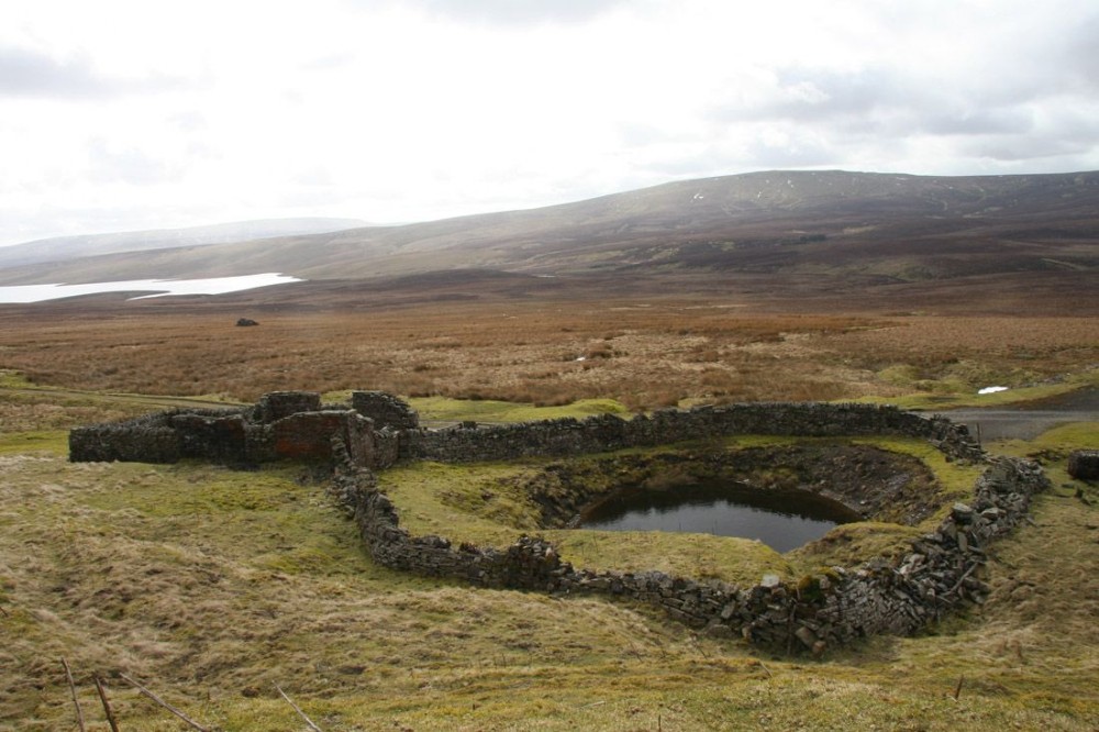 The main pumping and winding shaft for Greenhurth Mine, sunk around 1870 and connected to the dressing floor by a waggonway. The power for the pumps was a waterwheel situated below the dressing floor.