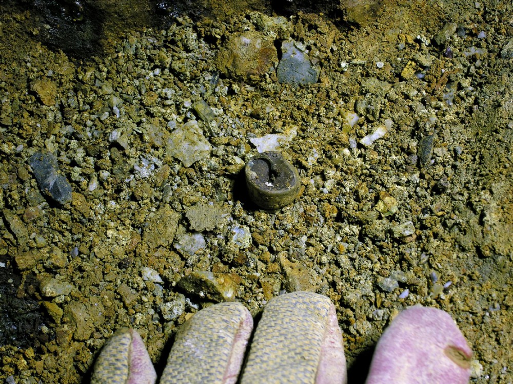 A tiny tallow candle stump on the xx fathom level, the gloved hand is providing scale.