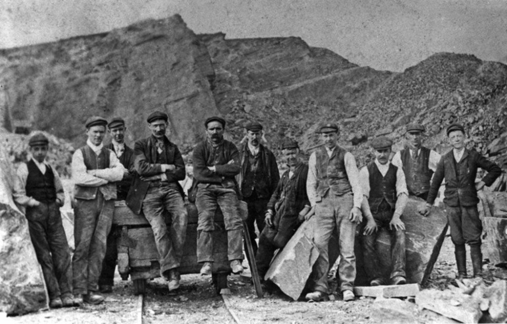 Early 20th century view of the workers at Tegg's Nose Quarry. At this time the quarry was owned by the Wetton family from Bollington.