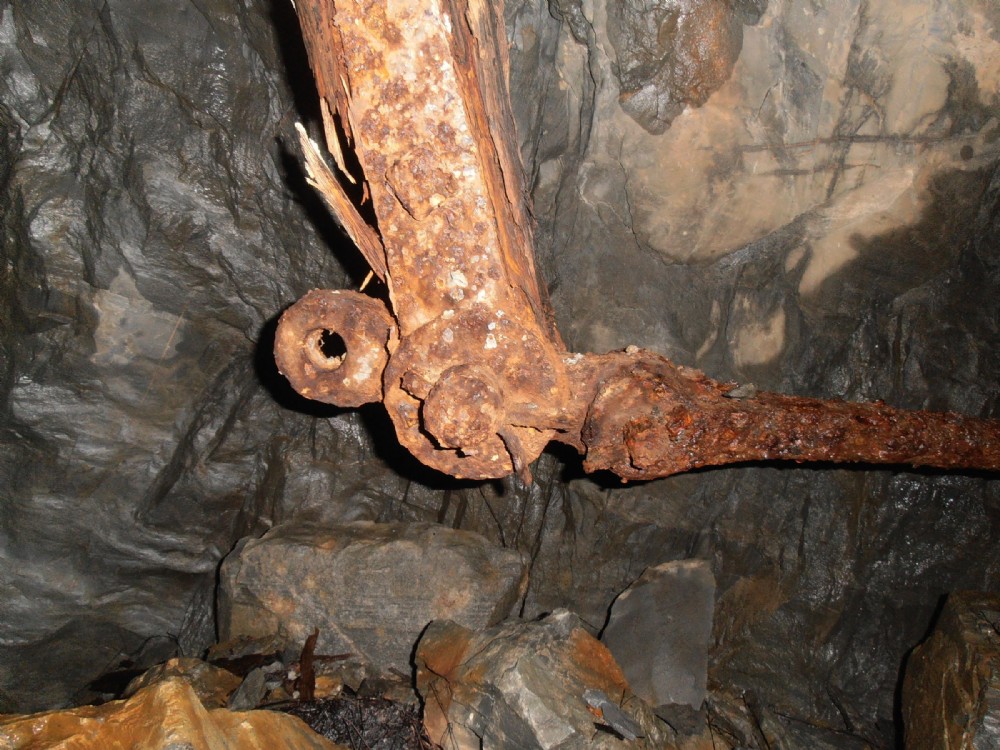 Deep Adit, wire rope to flat-rod transerring lever mechanism. The wire rope would have attatched at the left hoop and the flat-rod is still intact on the right.