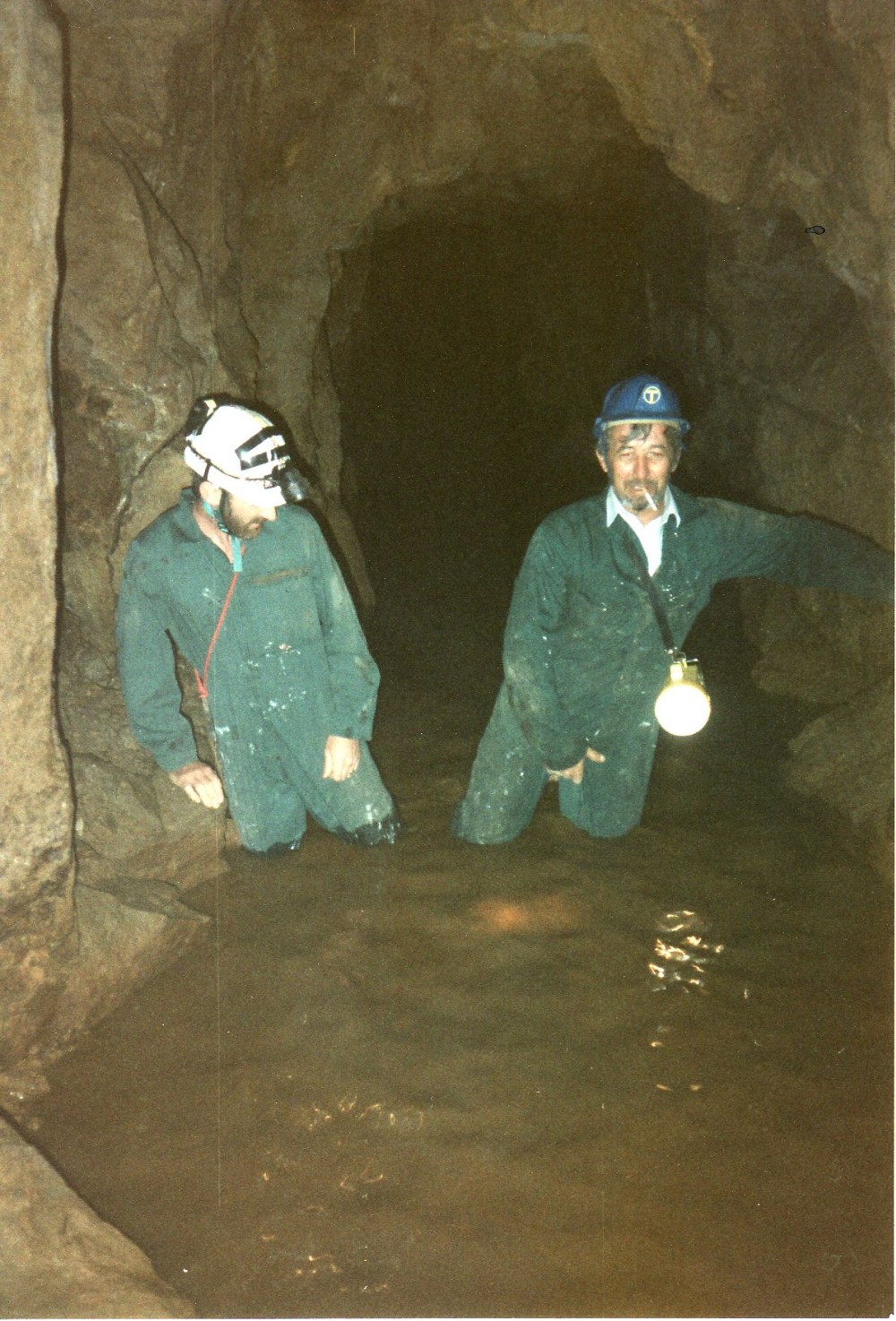 Steve Wadlan (left) - the semi flooded adit of Wheal Frementor 12/7/1989.