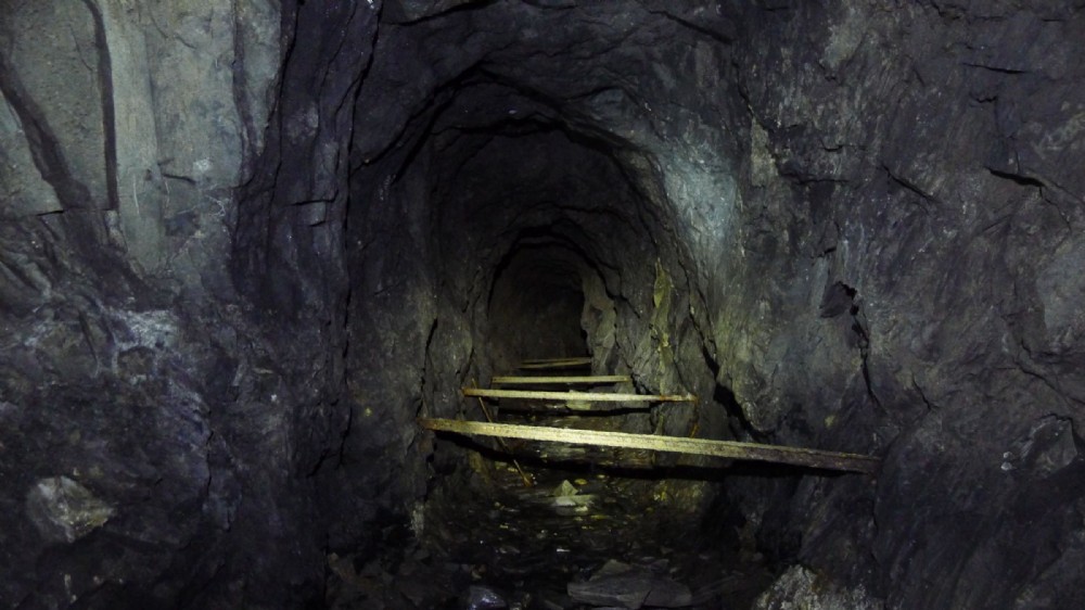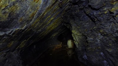 The dams are the name given to a level connecting Cwmorthin floor C and Oakeley floor 1. Water from Cwmorthin old vein drained out into Oakeley this way. A wooden walkway supported on metal rails was constructed over this drainage channel which was later dammed to provide a cooling water supply for the Oakeley chamber 33 air compressor.