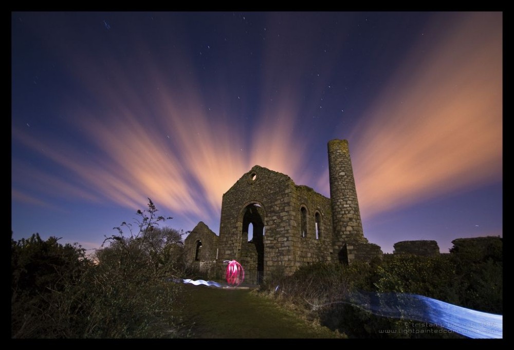 My fascination with the Cornish Mines, is to use them as unique backdrops to lightpainted photography. This is Marriot's Shaft in February 2010.