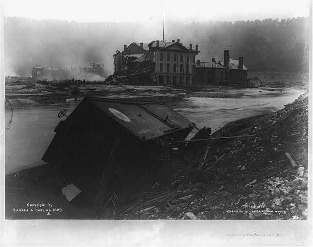 The flood, Johnstown, Pa., showing debris, warehouse of Cambria Iron Works