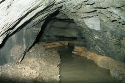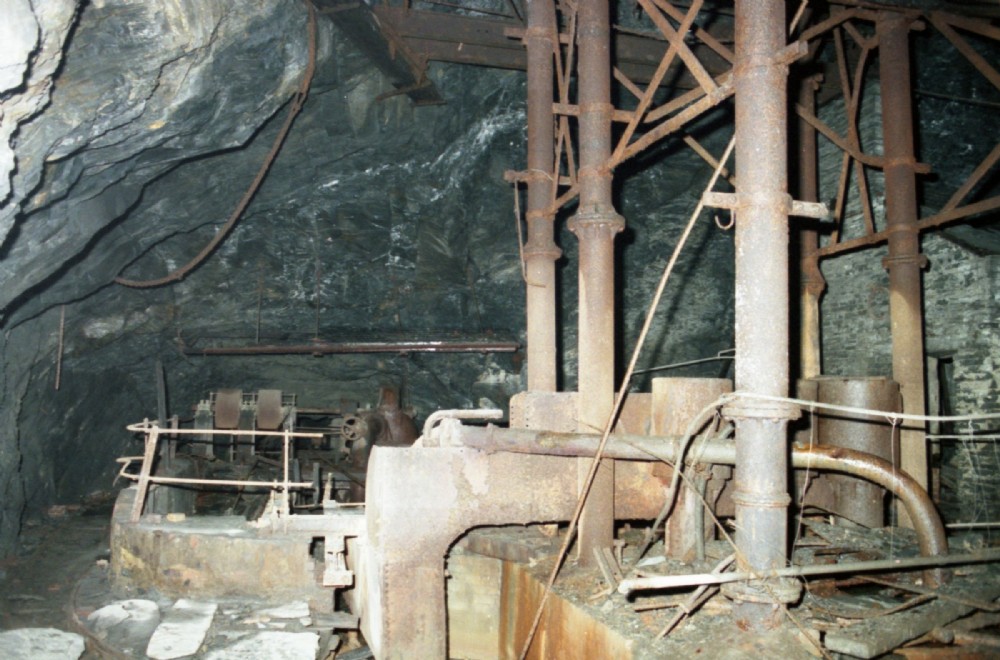 A view southward in the G Pump chamber ("Pwmp Mawr") with the pump shaft from L floor, with the discharge in the foreground and the remains of the drive etc. from the turbine beyond it and Lefal Dwr continuing in the distance.