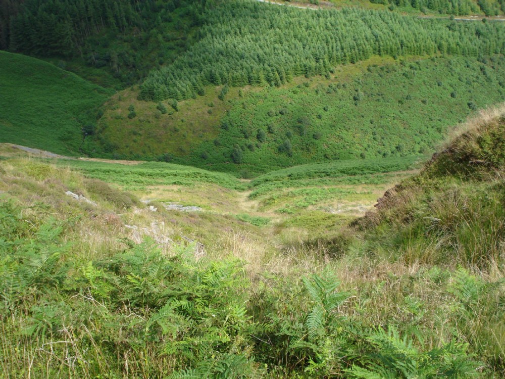 Looking down the hush gutter. The tip from the Llettymarallt Adit can just be seen on the far left.