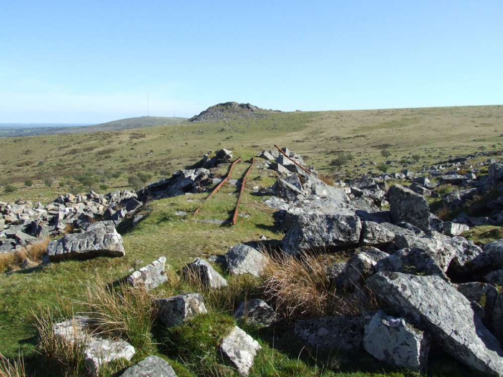 100 Looking along the large finger dump with the narrow-guage tramway, Sharp Tor centre, Caradon Hill to the left.18-05-13.