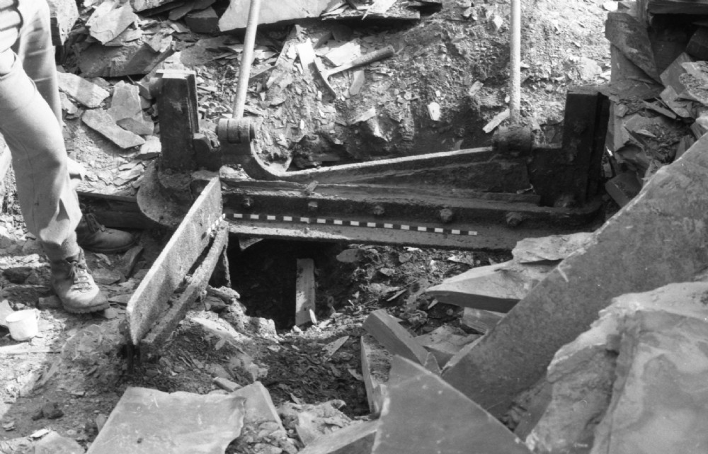 Unlike subsequent dressers, the Mathews machine was substantially built into the mill structure, working like a vertical guillotine.