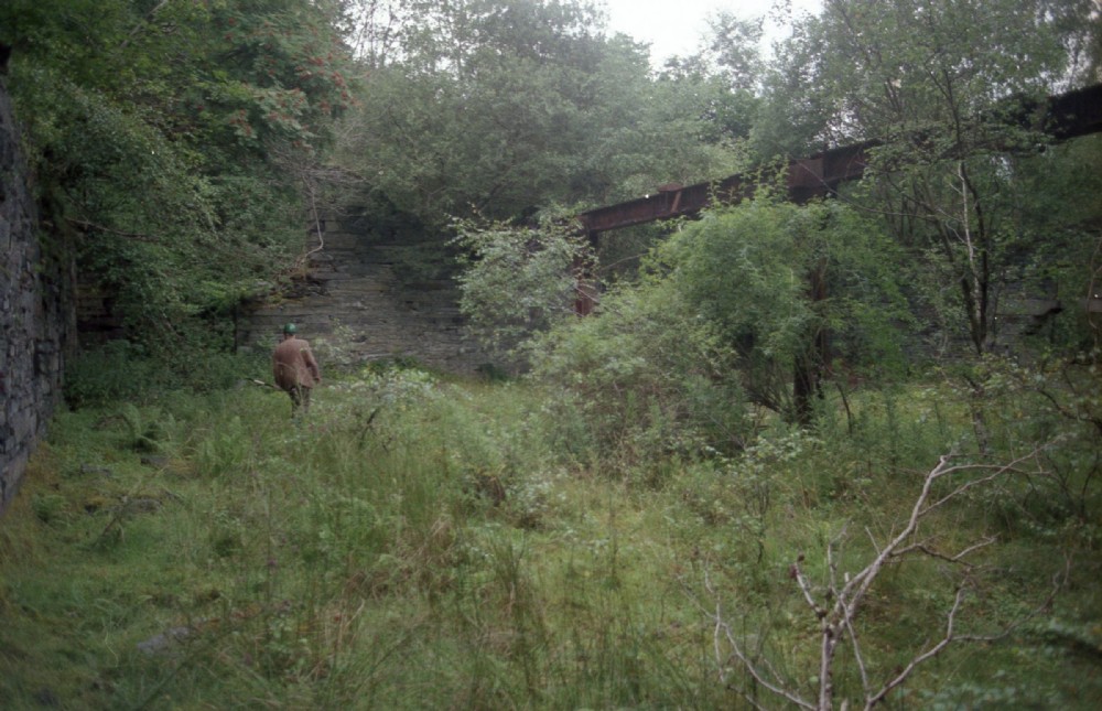This is the 'new' mill of 1867. This view is looking west towards the exit incline drumhouse which abuts the west wall. Note the overgrowth, trees and the girdering.