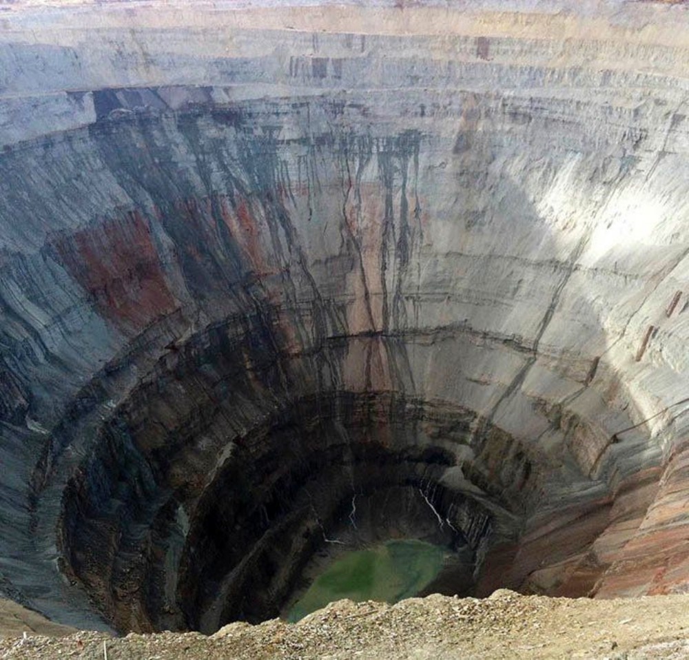 The Mir mine in Yakutia, one of the largest excavated holes in the world (525m deep, diameter 1200m) on an ordinary day and now, blanketed with smoke from wildfires