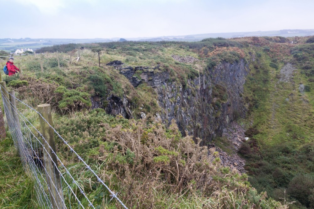 A view above from the nearby tramway which connected the Porthgain complex with dolerite quarries. This original slate quarry, now partly infilled, was connected by tunnel to the harbour complex below, where it is possible to see its entrance. Here was a water powered slate dressing mill near the harbour together with an extant line of houses, known as The Street, built for the slate workers. The quality of the slate does not look particularly good!