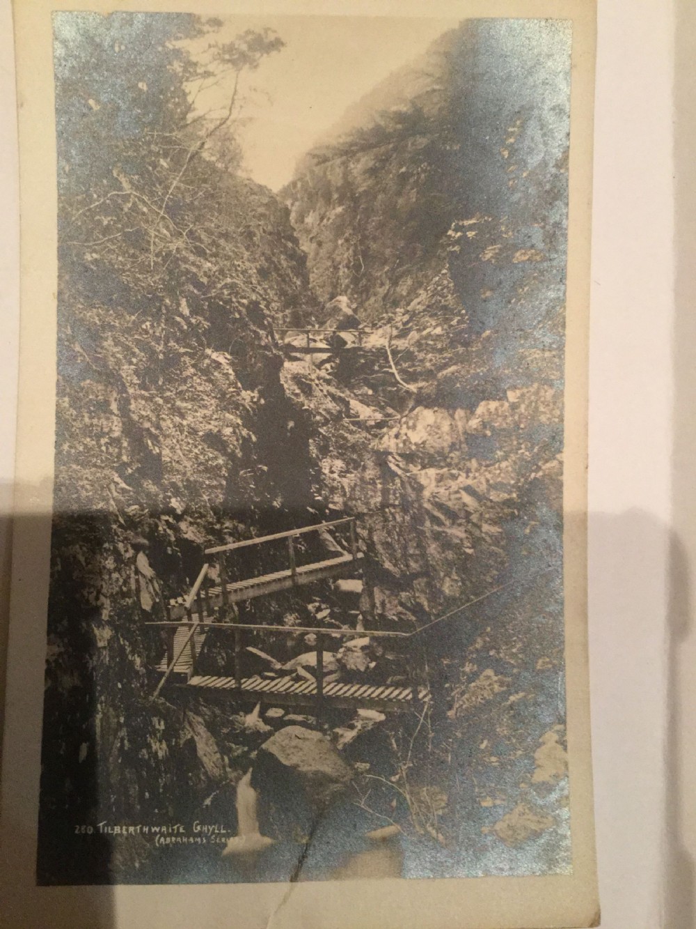 Interesting old postcard of Tilberthwaite Gill. Shows the walkways in the gill. Probably originally built to access various copper mine trails in the gill. But then used by Victorian Tourists to see the waterfalls. Something that had Victorians very excited.