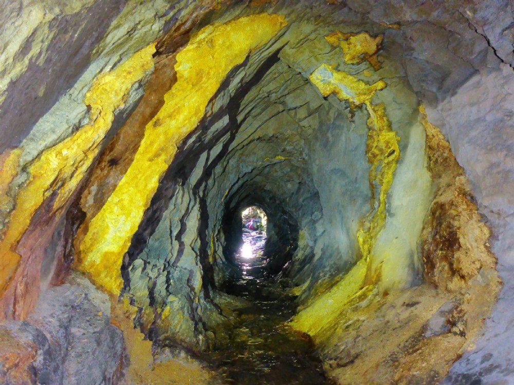 Colourful mineralisation even though this adit was dug to simply carry water to the mill.