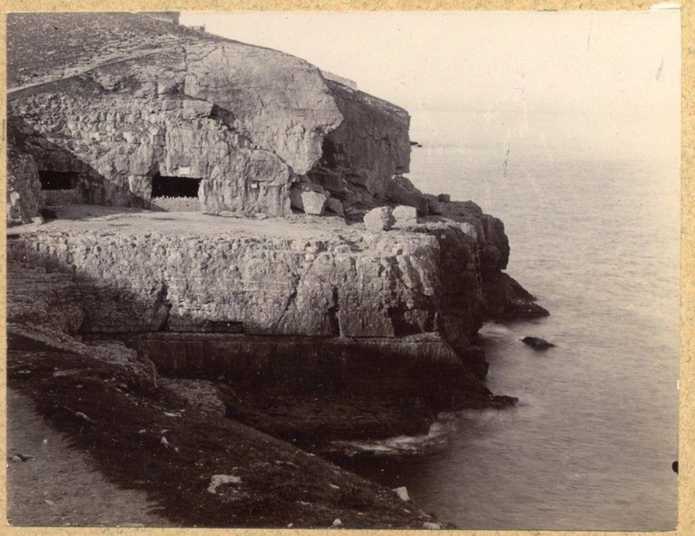 Caption: Tilly Whim, Swanage. Portland section, showing openings of quarries (so-called caves) in the freestone Beds.