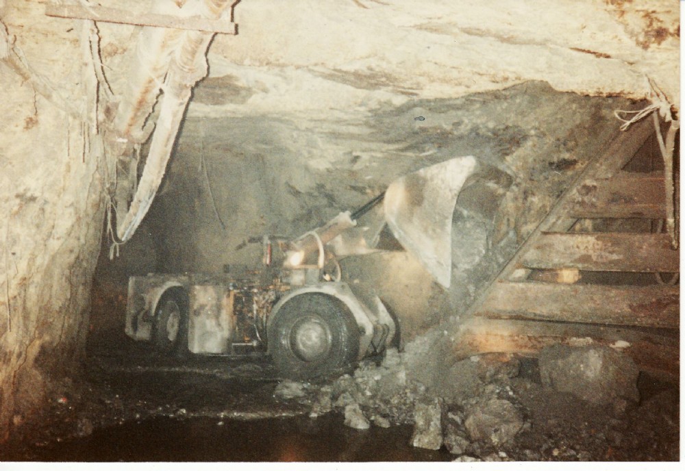 Scoop tipping ore down the Ore shaft. 19/5/1990.