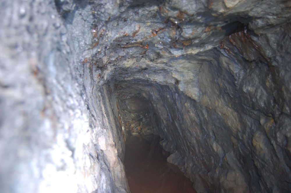 Interesting section for its small mineral tites ( brown and black rippled nodules. ) and slanting rock boundary, the left wall being naturally smooth. This section is the the most North Easterly portion to the left of the water filled adit as depicted on the .pdf. There is a possible fall blocking further tunnels at the top of the cross as seen on the map. ( The photo show the view to West with the blockage being to the East.)