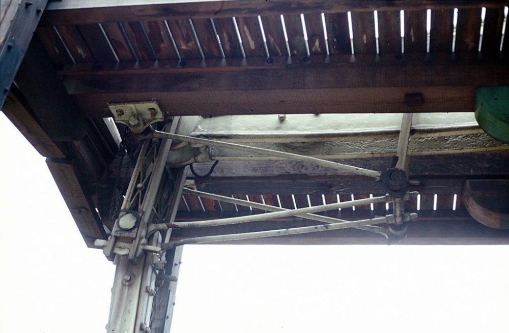 Detail of the outdoor end of the beam (under the bob platform) on the Elsecar Newcomen Pumping Engine, 6th May 1984. (Scanned from a damaged slide, image restored as much as possible in Photoshop).