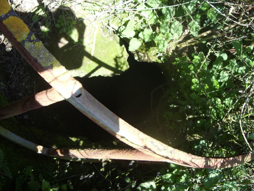 beside coast path just below Acton Castle with some barbed wire, chicken wire and an old round feeder around it. Please replace chicken wire, it prevents animals falling down shaft