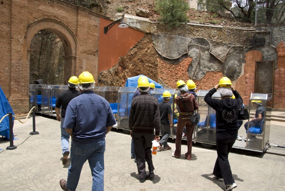 Access to the tourist mine is via a 'train'. This is battery driven trackless vehicle which is guided by a single slot in the floor of the level. All visitors have to wear hairnets and helmets