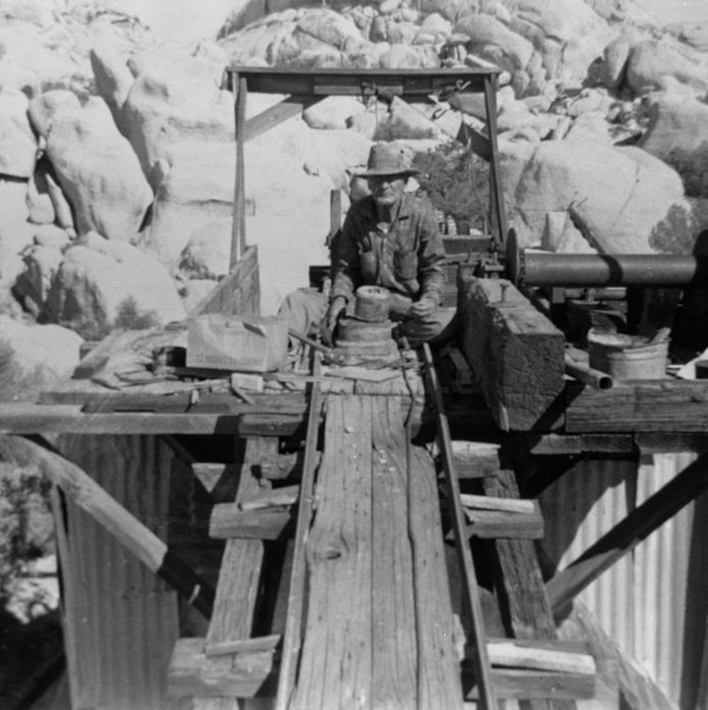 HISTORIC PHOTOGRAPH SHOWING BILL KEYS SITTING AT TOP OF TRAM, PREPARING MILL FOR OPENING LOOKING TO NORTH/NORTHWEST.