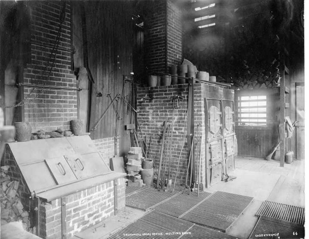 Treadwell Assay Office, melting room [probably Treadwell Mine; brick furnace in center].