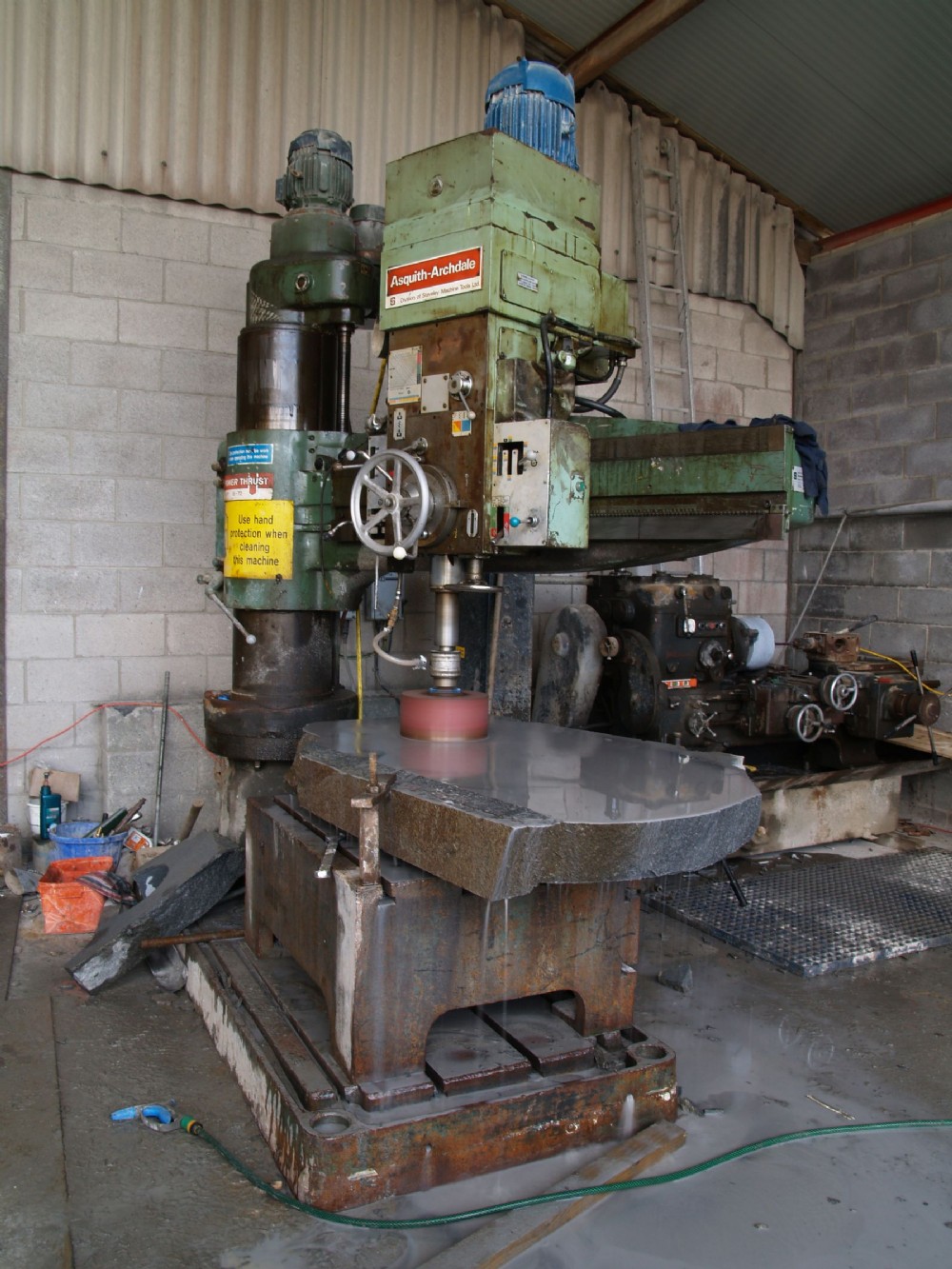 The lathe, right background, is used for drilling the handle-hole in the blanks.