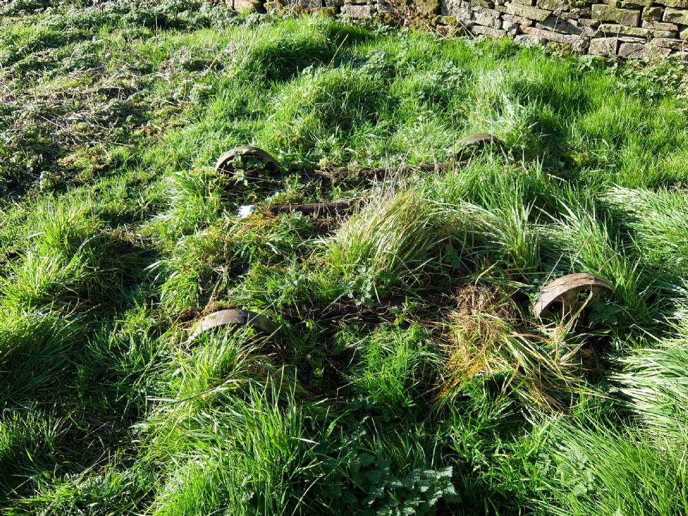 4 wheeled iron trolley, well overgrown with grass and moss. Could have been part of the Brickworks?