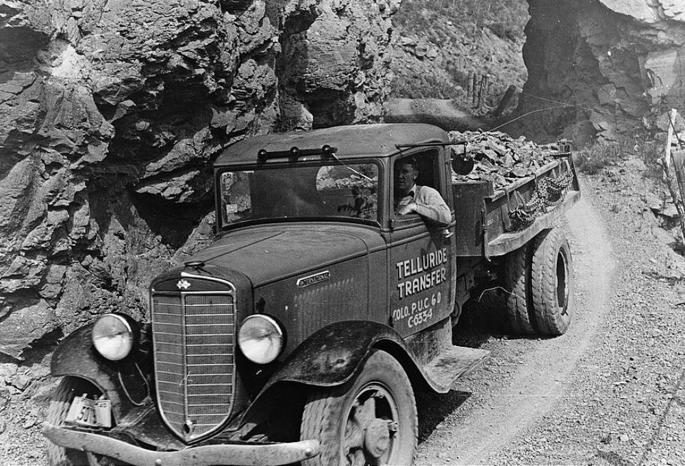 Ore being brought down from the gold mine by truck, Telluride, Colorado about 1940.