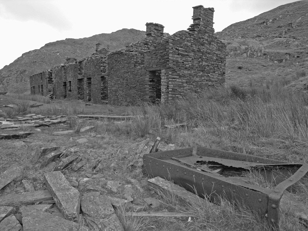 An upturned truck lies abandoned in front of the barracks.