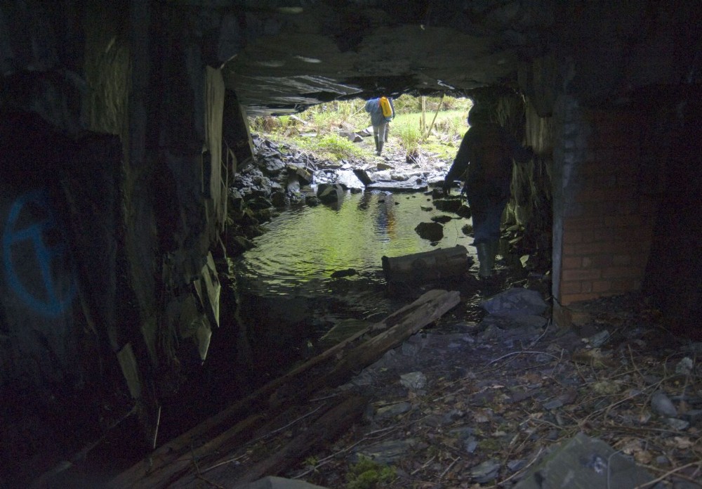 Tramway leading out of tunnel from bomb store into bottom of small pit before heading onwards.