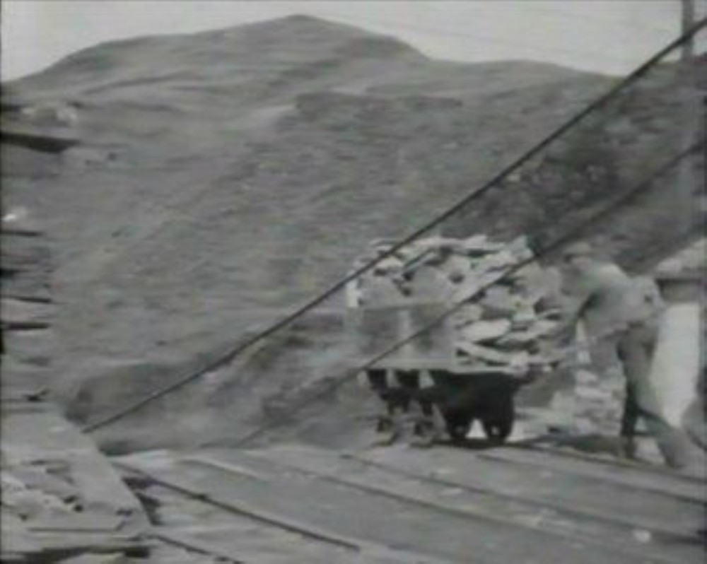A wagon load of waste slabs is hauled up and arrives at the crimp for tipping.