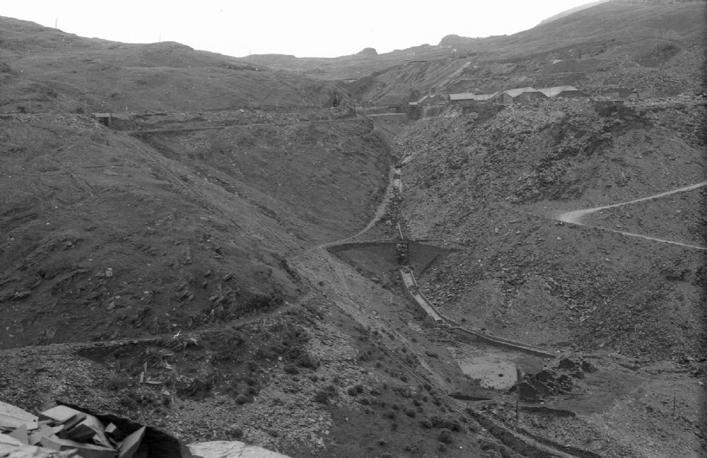 Taken from the Maenofferen tip, with the main mills beyond. Looking down at the Votty culvert (dry) - actually the diverted and channelled Afon Bowydd.