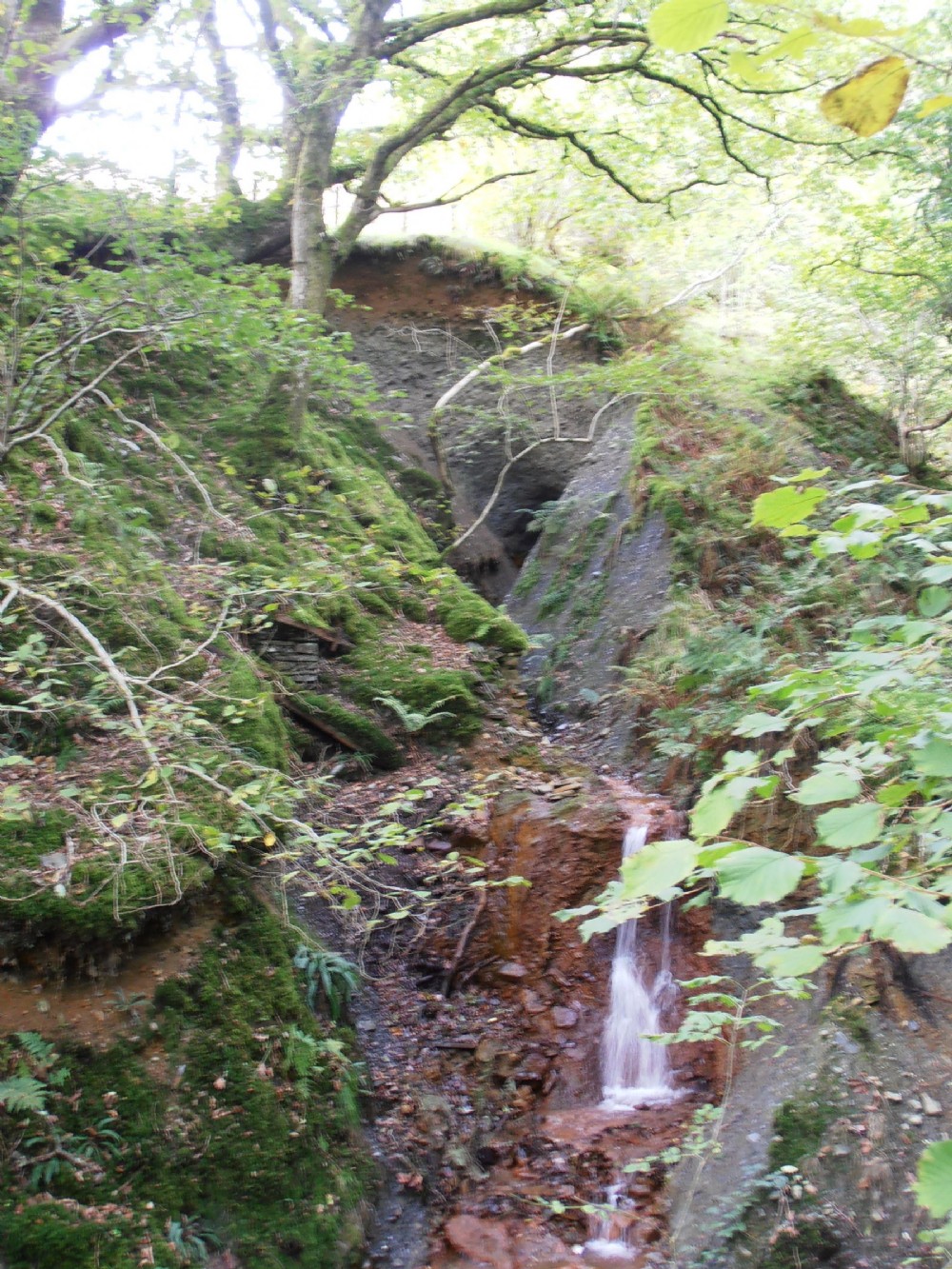 The earth that was swept downstream by the water exploding from the adit in the 1980s. Please note the corner of a building on top of the waterfall.